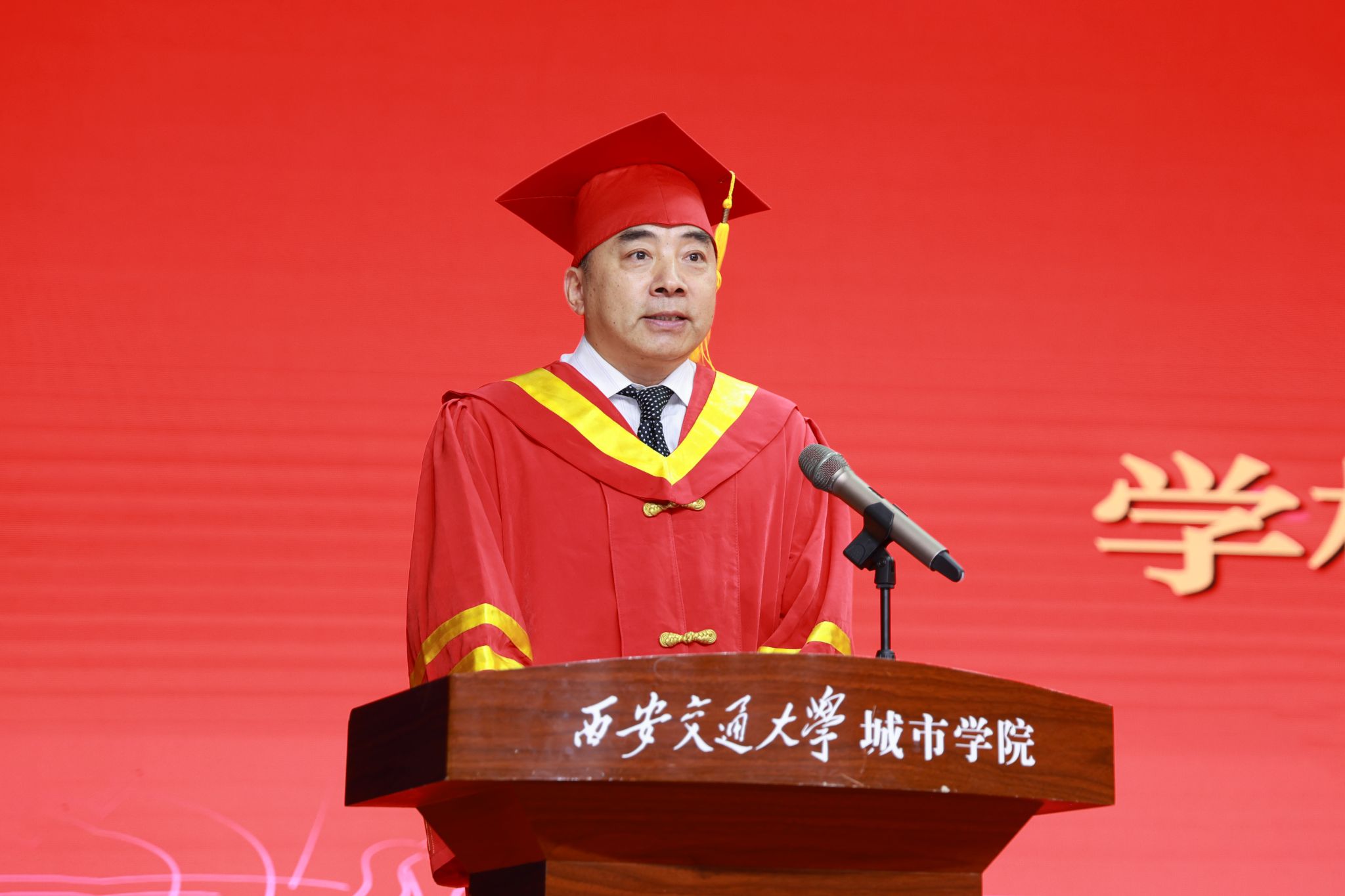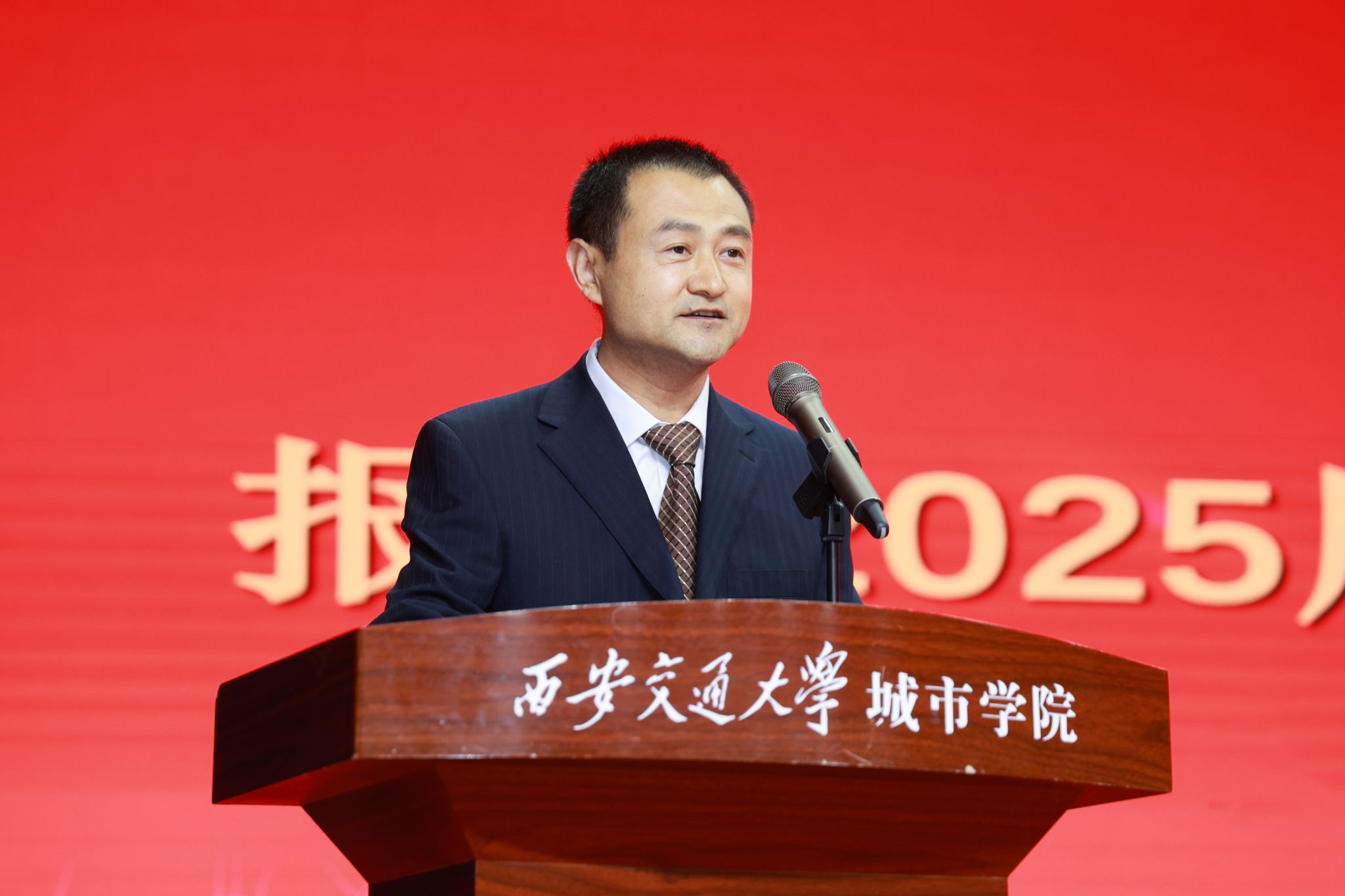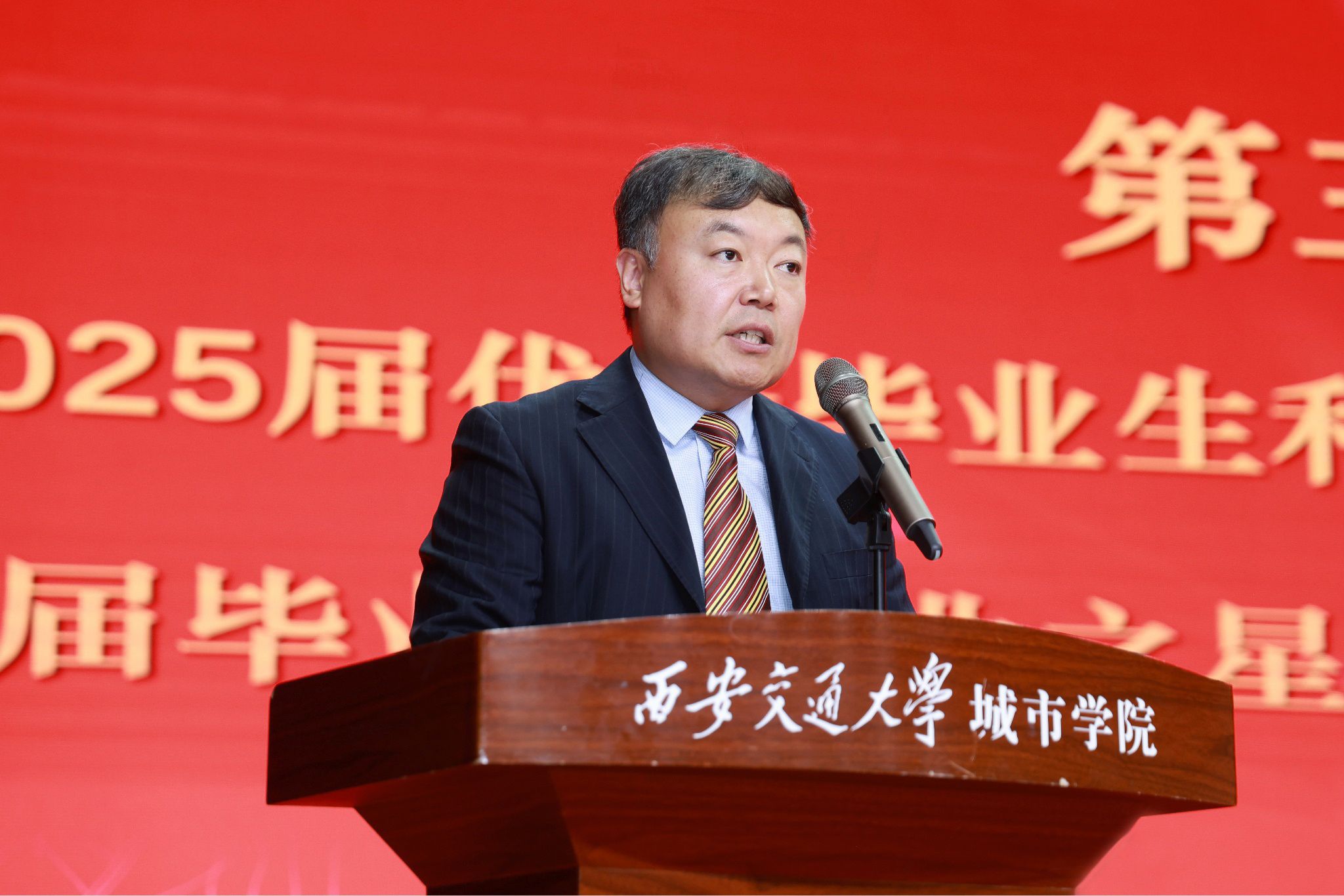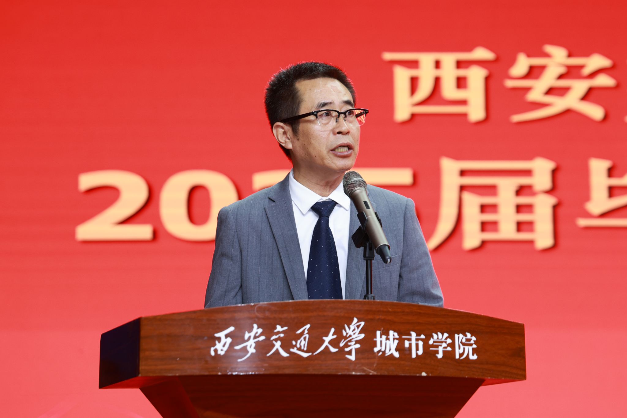 朱旭副校长(代理校长)寄语毕业生,与毕业生们一起回顾了大学四年间的点点滴滴,一同梳理了大学期间大家全方位的成长蜕变。在2025届毕业生即将走向未来广阔天地之际,他送给大家三个“心”,期望毕业生们将其内化于心、外化于行。一是永葆进取心,要保持终身学习的态度;二是坚守责任心,要牢记城院人的担当,传承“西迁精神”的家国情怀;三是保持平常心,既能享受成功的喜悦,也能坦然面对暂时的失意。他希望大家怀揣壮志,勇敢前行,以无畏之姿披荆斩棘,用拼搏之笔书写华章。无论大家身在何方,母校永远是大家坚强的依靠,母校的大门永远为大家敞开。在毕业生们即将开启人生新征程之际,他衷心祝福2025届毕业生们逐梦远方,前程似锦,未来可期!