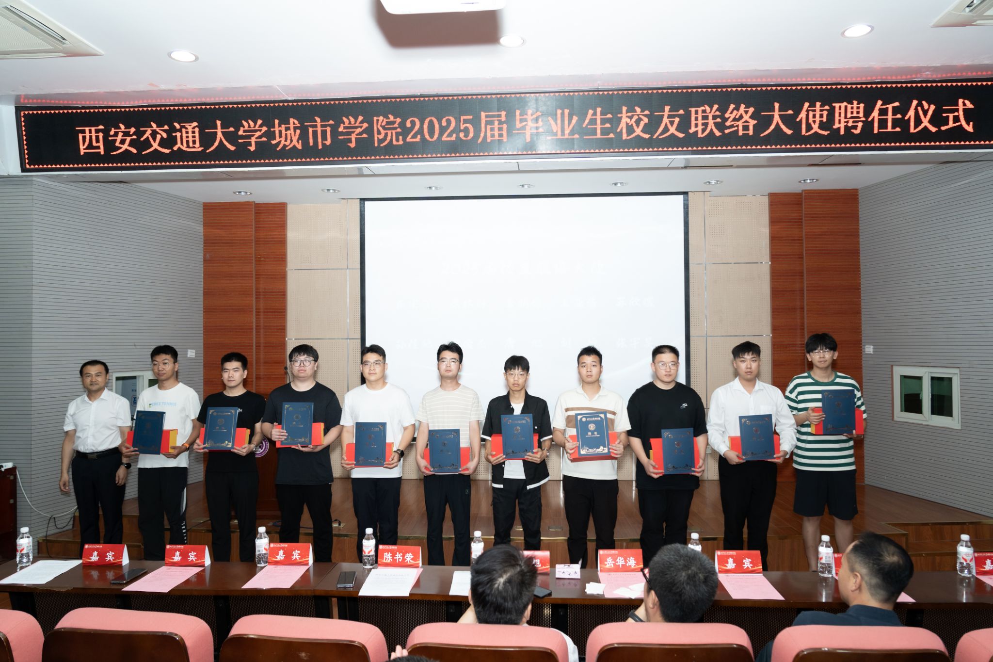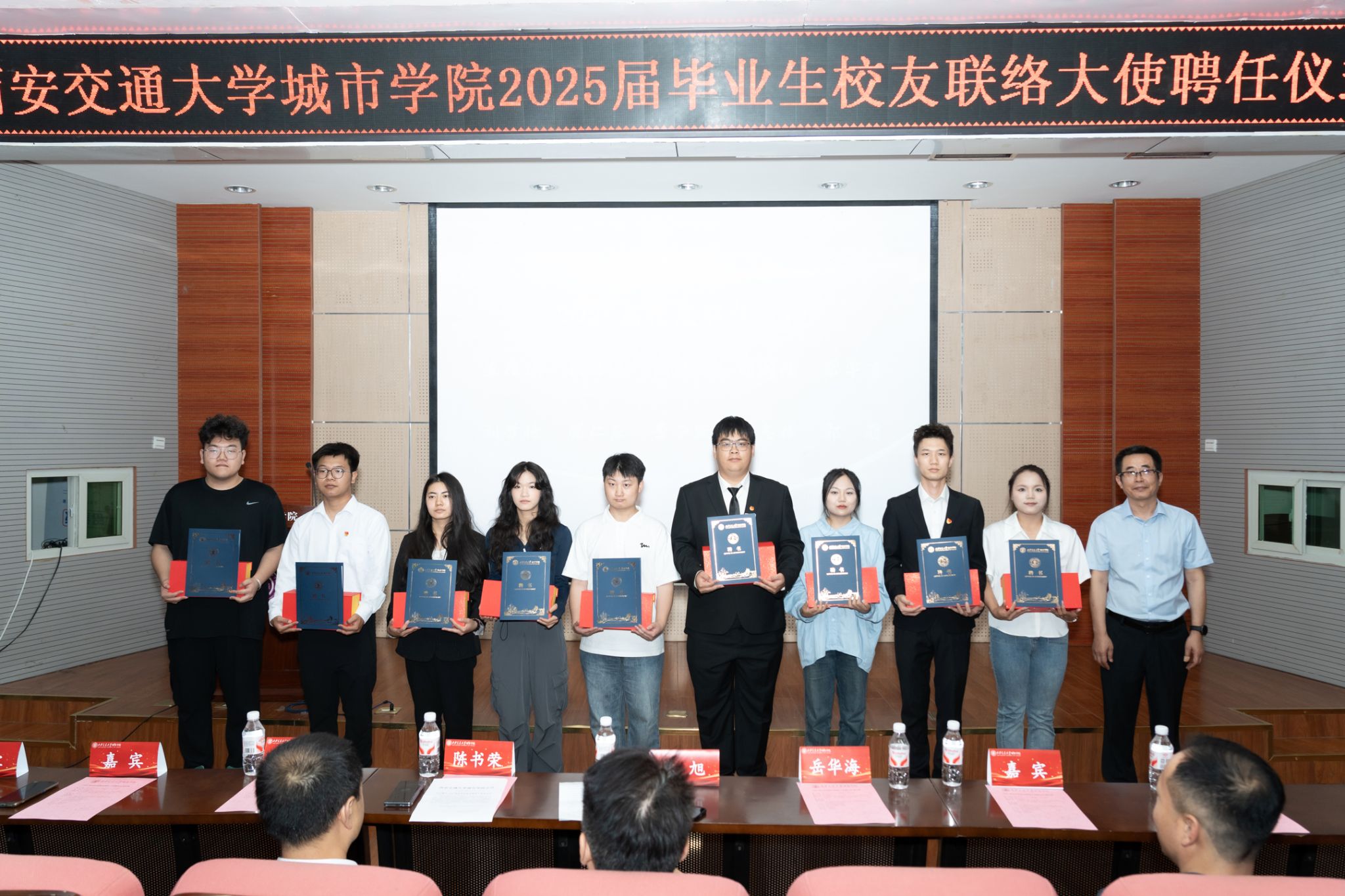 会上,党委副书记、副校长陈书荣宣读了《关于聘任2025届毕业生校友联络大使的决定》。随后,党委副书记、副校长陈书荣,副校长岳华海为校友联络大使颁发了聘书和纪念品。