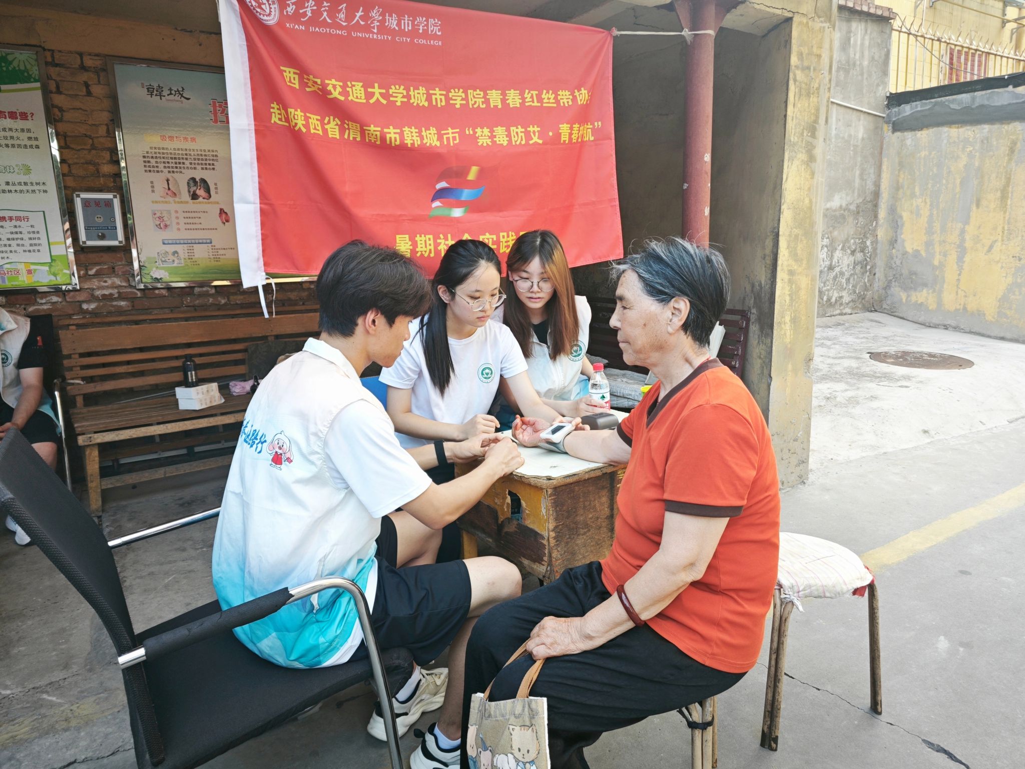团队锁定“新型毒品伪装识别”“防艾知识互动学习”等居民核心需求,针对不同群体设计调查问卷,为老年群体制作大字号图文手册,同步讲解毒品伪装术与防艾要点。此外,团队联合社区卫生服务中心举办宣讲活动,开设“健康驿站”,提供免费血压、血糖检测。