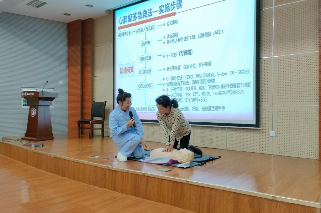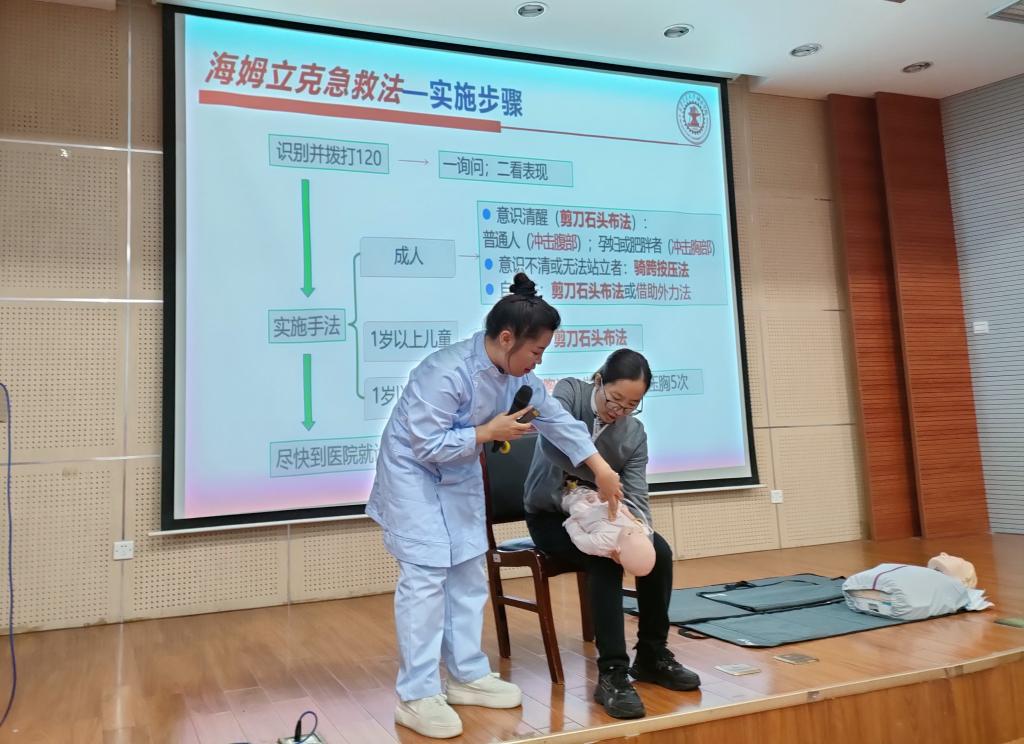 伴随着热烈的掌声,丁老师开始为教职工们介绍海姆立克急救法和心肺复苏急救法。丁老师用通俗易懂的语言,搭配图文并茂的课件,深入细致地讲解了这两种急救法的定义、原理以及实施步骤,现场示范了实施手法,并邀请教职工通过人形模具进行了操作演练,充分调动了教职工的学习兴趣,讲座现场气氛活跃,培训教学效果良好。丁老师指出,掌握基本的常见突发疾病救护技能,第一时间采取力所能及的急救措施,能最大限度地给自己和家人提供更多的治疗时间和生存机会,挽救生命、减轻伤害、控制病情。