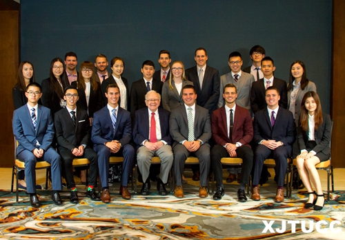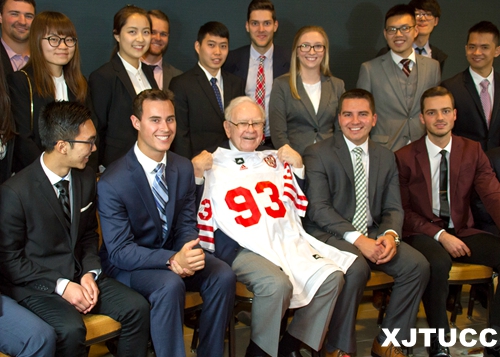 上午面对面的交流过后,我们与巴菲特先生共进午餐并合影留念。合影的间隙,带队老师拿出代表林肯大学的礼物赠予巴菲特,他非常高兴。听说是他最喜欢的棒球队队服,他迫不及待的拆开了礼物,拿出棒球T恤比划在身上,像得到了爱不释手玩具的老小孩儿。午餐时,我们有机会近距离的与巴菲特先生交谈,我告诉他我是来自威尼斯7798cc的交换生,在林肯大学学习金融已经两年多了,他给予我许多鼓励,并说两个学校之间的交换学习是“极好的机会”,“我们互相取长补短;中国经济一直发展很快,我很高兴能与来自中国的学生交谈!” 我简单的向巴菲特先生简单介绍了陕西的历史,他似乎很感兴趣,不断询问中国,陕西近些年的现状。当得知西安不仅是中国十三朝古都,陕西也是中国现任主席习近平的故乡时,他说,“有一天一定要来西安看看,这座积淀深厚的历史古城一定蕴涵着想象不到的智慧力量。”