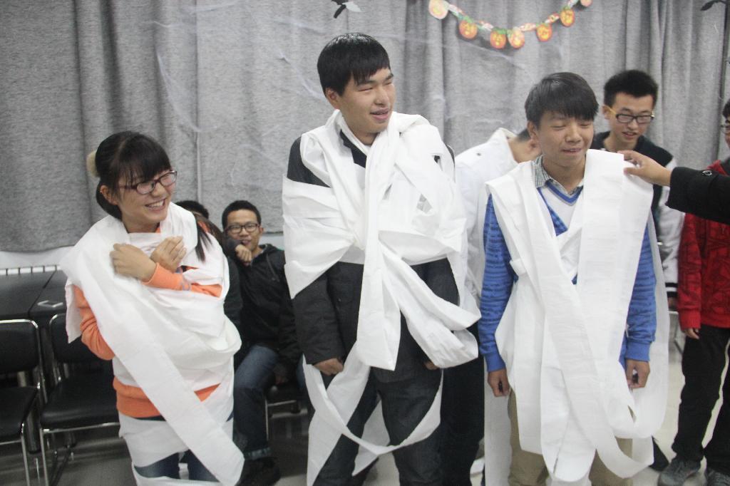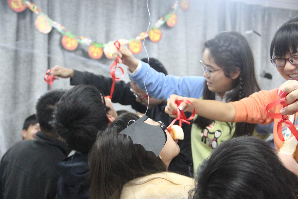 派对开始时Amy和同学们边吃边聊,向大家介绍了万圣节的由来和传统。紧接着,大家做了吸纸片、纸条缠人和抢吃甜甜圈等传统的西方万圣节游戏。最后,大家点燃了南瓜灯,一起观看了恐怖电影度过了轻松愉快的夜晚