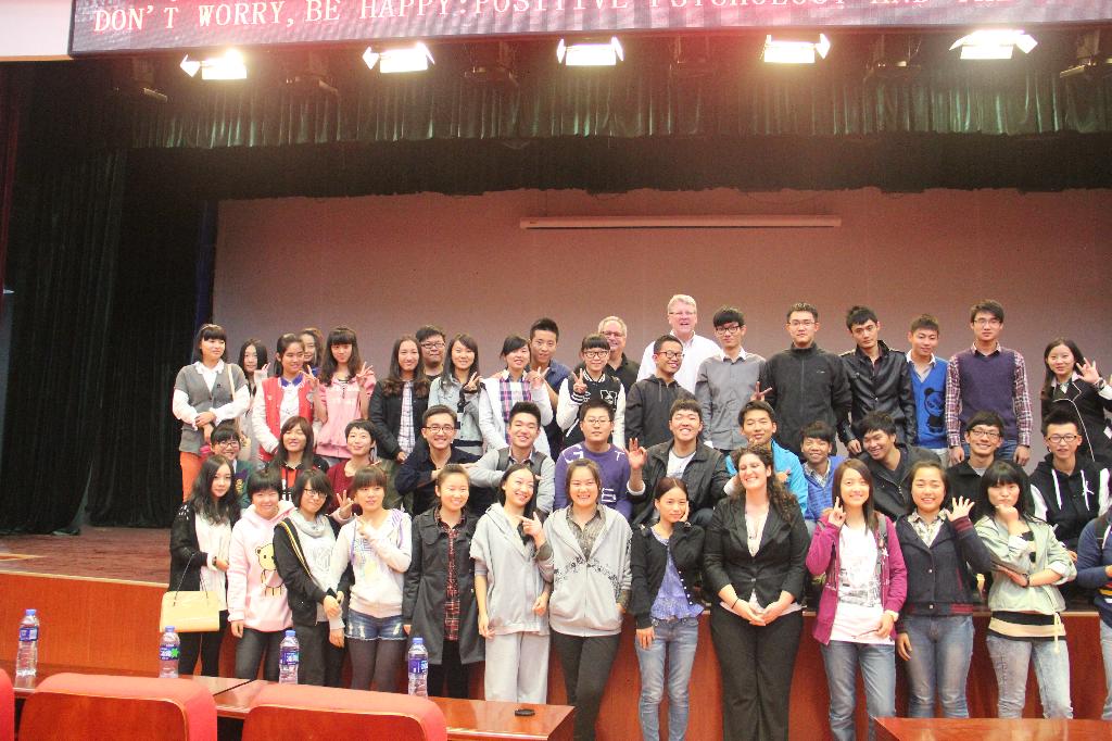 首先,Robert教授一段风趣幽默、图文并茂的开场介绍引得大家捧腹大笑,极大地提高了同学们的兴趣和积极性。接着他阐释了快乐的定义、重要性以及如何才能变得更加快乐的方法,并用一个关于压力的小测试鼓励大家积极参与互动。随后,担任讲座主持人的中美项目办大一学生张煜果协助Robert教授用中文帮助大家做了叫做“冥想”的放松活动,有的同学很投入,甚至当场进入深度冥想状态。最后,同学们用中英文踊跃提问,和Robert教授交流心理学方面感兴趣的话题。整场讲座气氛热烈,使同学们了解到了积极心理学方面的知识,开拓了大家的视野。
