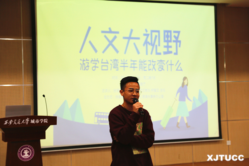 他着重介绍到中国文化大学交通便利,地理位置优越,气候宜人,还有美丽的夜景。学校设施也很丰富,有知识储备量丰富图书馆、藏品诸多的博物馆、拥有完善设备的体育馆等。除了这些设施,许多我们熟知的名人也是中国文化大学的校友,学校还有许多不同机会让大家学习,有丰富的校园活动,还有物美价廉的校园演唱会,姊妹学校的校园博览会。不仅如此,学生去台湾后,还可以体验诸多的的课外活动——跳伞、深潜水、卡丁车……接着,他又展示了许多去文大交流的优秀学生的心得感想。