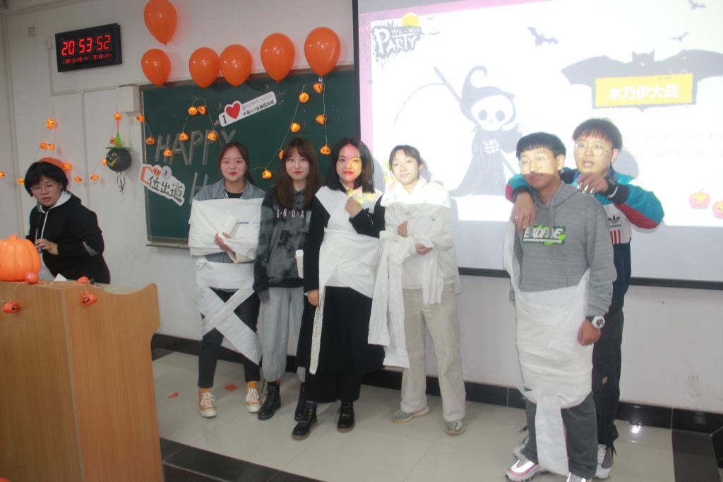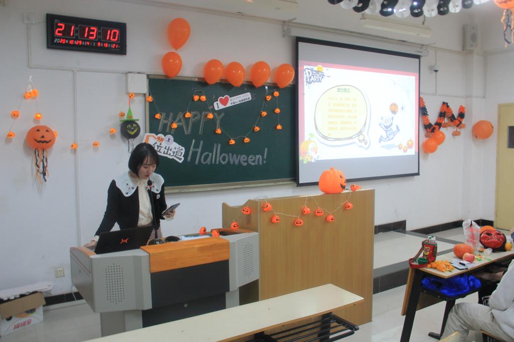 万圣节派对在诡异神秘的音乐中拉开序幕,现场所有人沉浸其中,心怀期待。紧接着,中英国际班李怡辰同学担任主持人,用双语为大家介绍了万圣节的由来、西方人的庆祝方式和万圣节必备食物,并请到场所有同学品尝了中英办精心准备的糖果。随后,廉宇婷老师、蒋美一帆老师也现场表演了精心准备的歌曲演唱,为万圣节活动助兴。随后,大家做了萝卜蹲蹲蹲、你比我猜、木乃伊大战、雕刻南瓜等游戏,游戏失败者受到相应的游戏惩罚,现场欢声笑语,热闹非凡。 最后,全体师生合影留念,共同度过了一个美好的的夜晚。