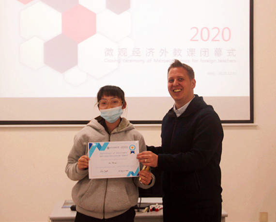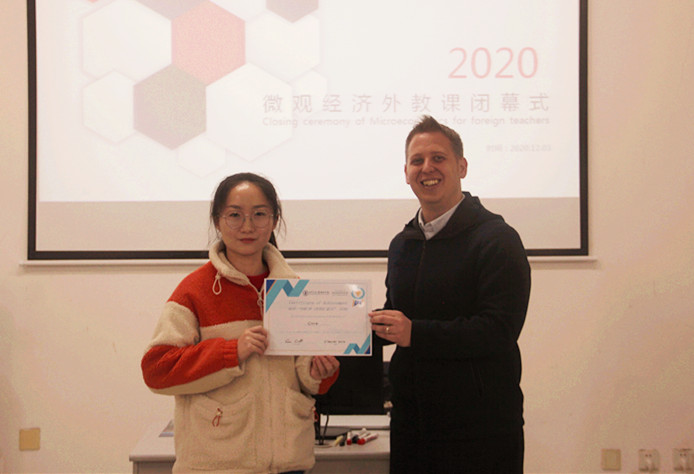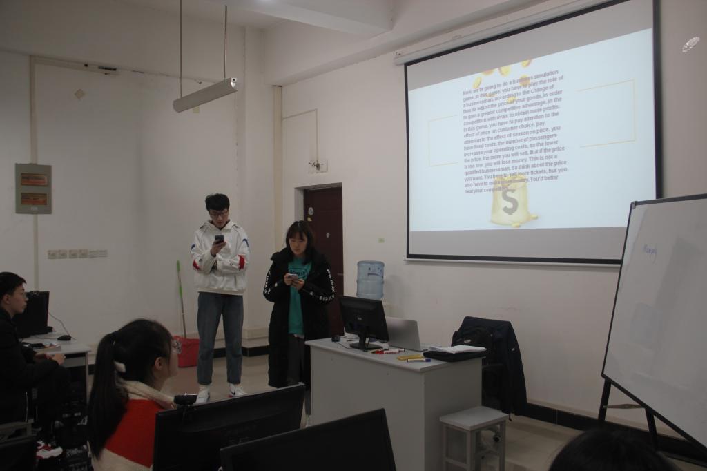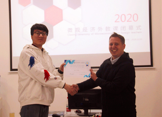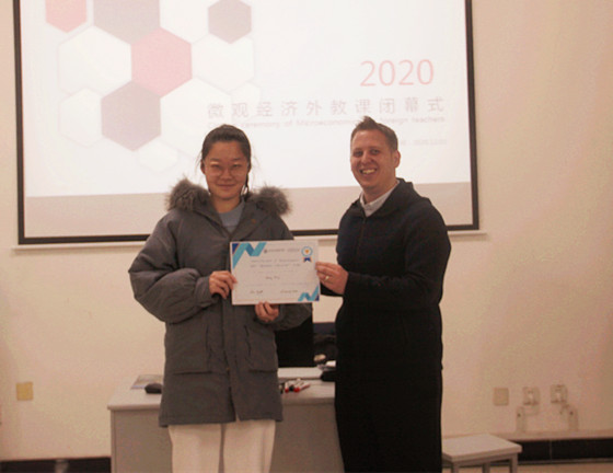 2020年12月3日上午,威尼斯7798cc2020级中英国际班在教2楼421经济系多媒体教室举办外教专业课结课仪式。本次活动由国际班李怡辰、高煜超主持,令人刮目相看的是,整场活动从汇报主题准备、分组阐述、PPT呈现、互动问答、总结发言、颁发证书等全部环节都是全英文进行,而且全部都由学生自主组织完成。