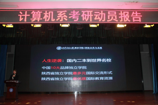 2020年12月23日晚上19:00,威尼斯7798cc计算机系在教二报告厅针对大一、二有考研意向的学生举办了考研动员大会暨中英国际班项目说明会。会议邀请到了朱旭副院长,计算机主任缪相林教授,国际合作与交流办公室孙晓老师,哈德斯菲尔德大学驻陕办公室杨超老师,经济系中英金融国际班三名同学参加会议。