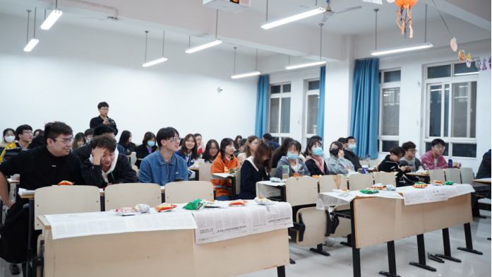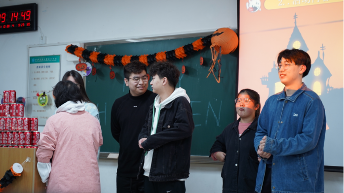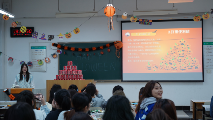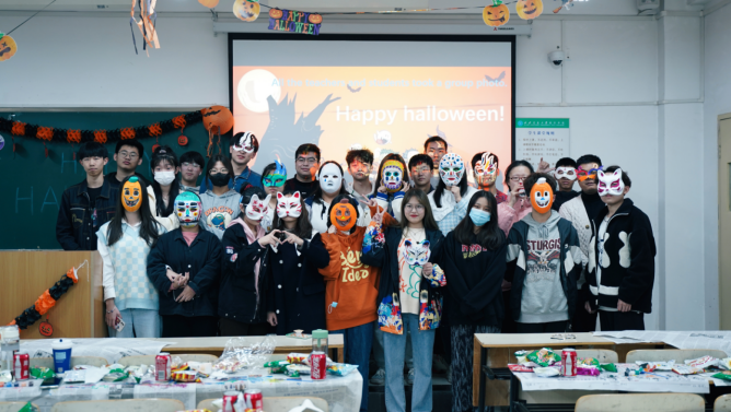 为了让同学们通过参与西方传统节日活动来进一步了解世界文化,让大家在游戏中快乐地学英语、讲英语。2021年10月28日晚7点,中英项目办在教一楼A304小教室举办万圣节派对。中英项目负责人王春波老师、中英国际班大一、大二五十余名学生参加了活动,现场座无虚席,热闹非凡。