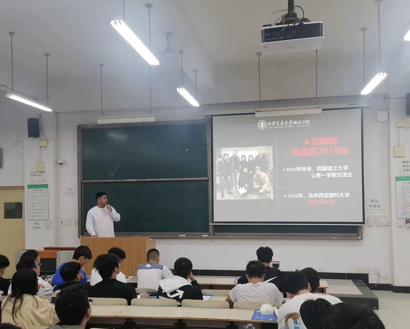 国际合作与交流办公室王春波、霍煜瑞、冯欣老师分别对学院3+1本硕联合培养国际班项目、学院成熟稳定开展的中美、中澳、中加、中英1+3/2+2双学士国际课程合作项目;公费一学期交流项目和寒暑期海外名校学分修读项目进行了介绍。在宣讲活动中,国际班王佳豪同学从不同角度分享了他在国际班的学习、成长心得,作为高考英语50分的他,经过国际班的一年学习,目前已经通过大学英语四级考试。他感谢国际班的平台,同时也希望学弟学妹们做好选择、提前规划,让自己的城院时光不留遗憾。