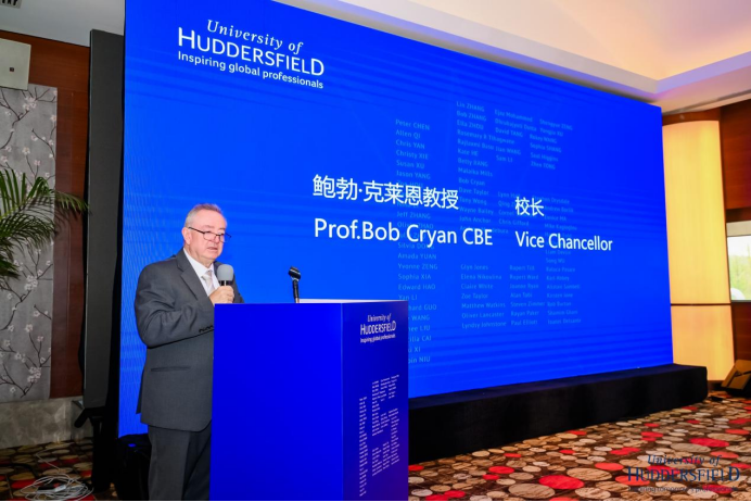 首先,哈德斯菲尔德大学校长鲍勃·克莱恩教授致开幕词。他对在这15年中默默支持哈德斯菲尔德大学工作的中国合作院校们表示了衷心的感谢,也对哈德斯菲尔德大学中国代表处在中国运营15年的卓越贡献及成就表示了肯定和赞扬。