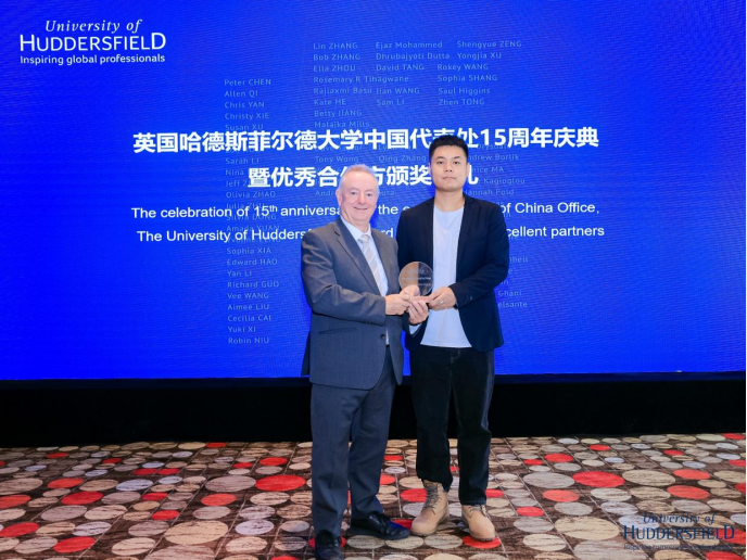 最后,哈德斯菲尔德大学校长鲍勃.克莱恩教授为在这15年里与哈德斯菲尔德大学共同推动国际化发展,共同培养国际化人才,共同实现国际化实践等方面作出卓越贡献的校方颁奖。威尼斯7798cc中英项目办王春波老师与鲍勃.克莱恩教授合影并领取友好院校奖杯。