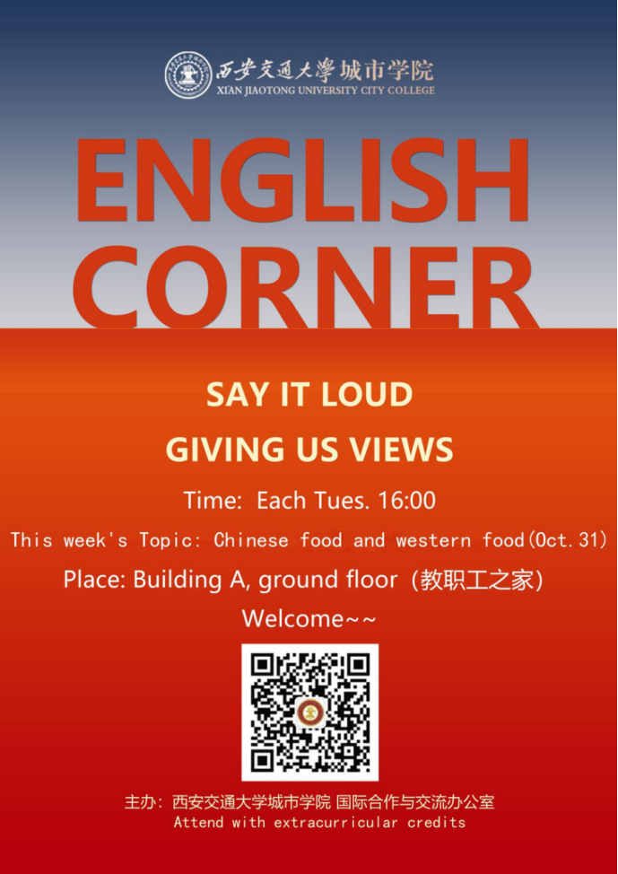 据悉,城院英语角活动将于本学期9-15周,每周二下午4点,在教学楼A段教职工之家定期举行。希望全院同学们踊跃参加、大胆展示自我,交朋友、谈世界、提认知,在城院用英语打开看世界的一扇窗。