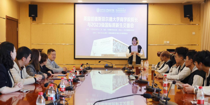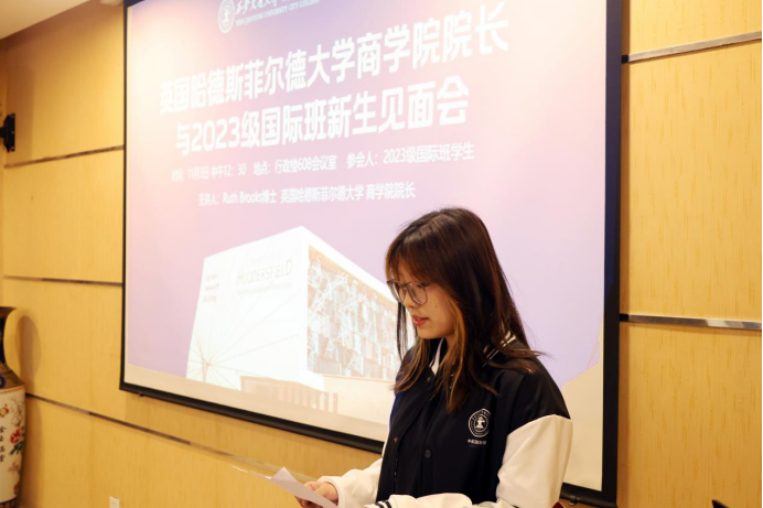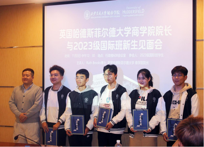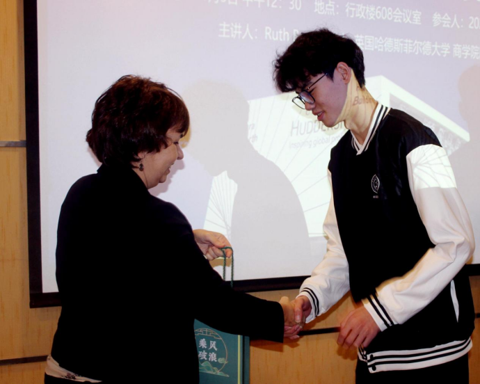中午,Ruth Brooks博士与全体2023级国际班学生开展见面交流会。她指出,通过两校举办的国际课程联合培养项目,国际班的学生们将会逐步实现梦想,成长为具备全球视野、创造性思维以及国际竞争力的综合型人才。国际班雅思课程负责教师张岳珺、2023级国际班李佳琪同学作为代表发言。张超老师为2023级全体国际班学生颁发了HUD中国办公室精心准备的定制礼物和定制校服。