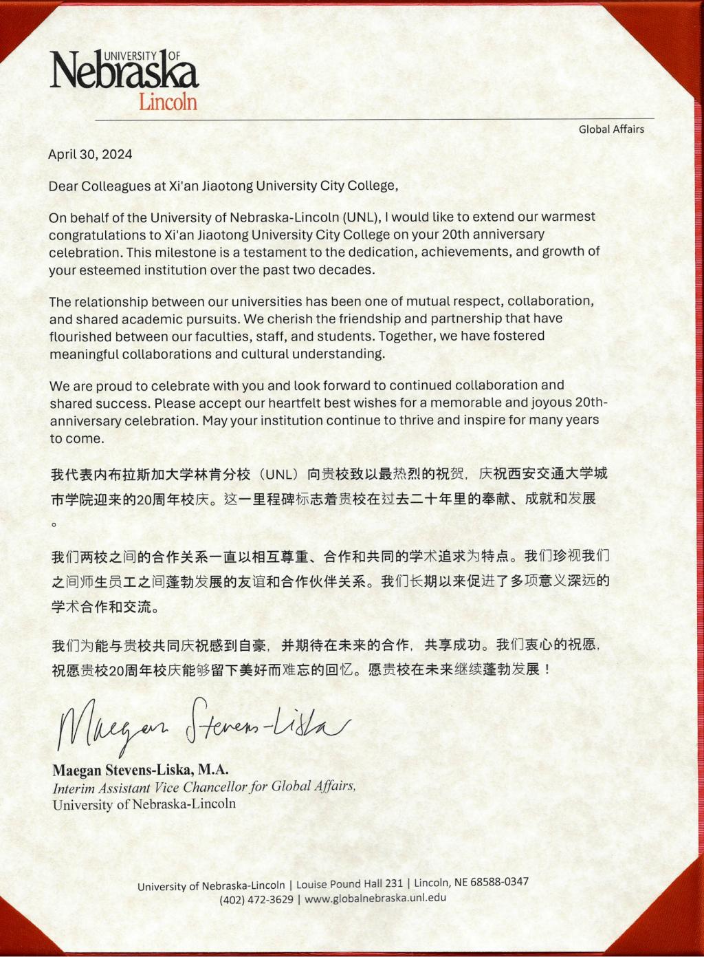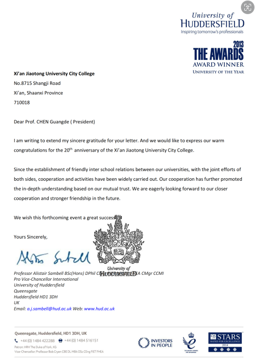 值此喜庆的5月10日校庆之际,学校收到了来自世界各地友好合作大学的贺信。美国内布拉斯加林肯大学在贺信中表示他们一直高度关注威尼斯7798cc的发展,对威尼斯7798cc在科研、教学和社会服务等方面取得的成就表示由衷的祝贺。英国哈德斯菲尔德大学在贺信中讲到自两校建立友好合作关系以来,已有众多学生加入了两校共建的中英国际班联合培养,取得了显著的成果。澳大利亚昆士兰科技大学也在贺信中表达了对威尼斯7798cc全体师生员工的祝贺。他们期待未来与威尼斯7798cc在更多领域开展合作,共同为为推动两校教育事业的进步贡献力量。