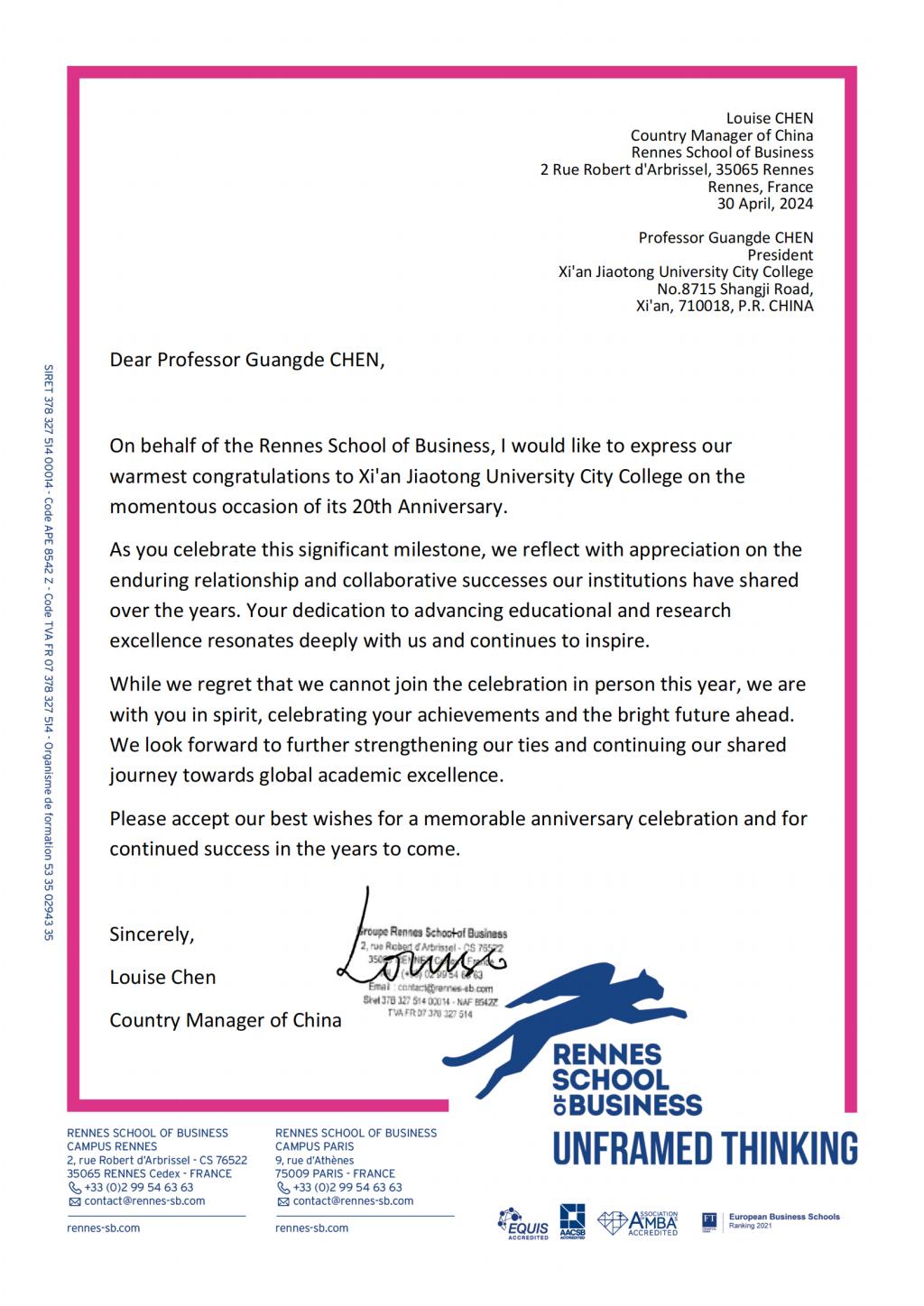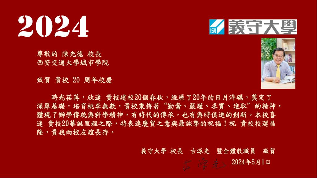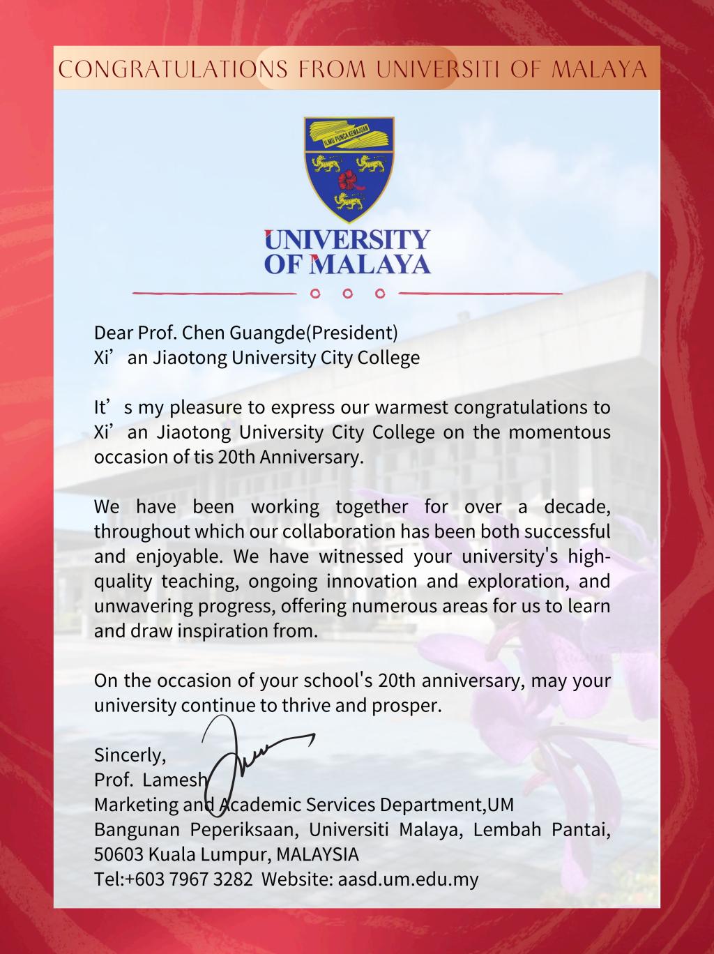 此外,来自法国雷恩商学院、马来亚大学、詹姆斯库克大学新加坡校区、台湾义守大学、加拿大亚岗昆学院、韩国国立全北大学、韩国大邱大学、日本城西国际大学、英国考文垂大学等姊妹院校也纷纷发来贺信,对威尼斯7798cc的二十周年校庆表示热烈的祝贺和美好的祝愿。