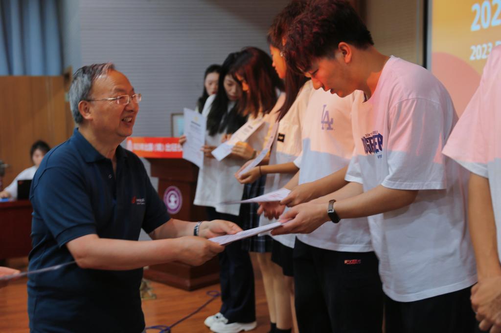 在出国(境)学生证书颁奖环节,外语系英语雅思课负责人张岳珺、经济系副主任杨健全、计算机系主任姚全珠、陈书荣副院长分别为2023年中英、中澳、中马、中韩、中国台湾、中国香港项目生等45人,颁发结业证书、录取通知书及纪念品。