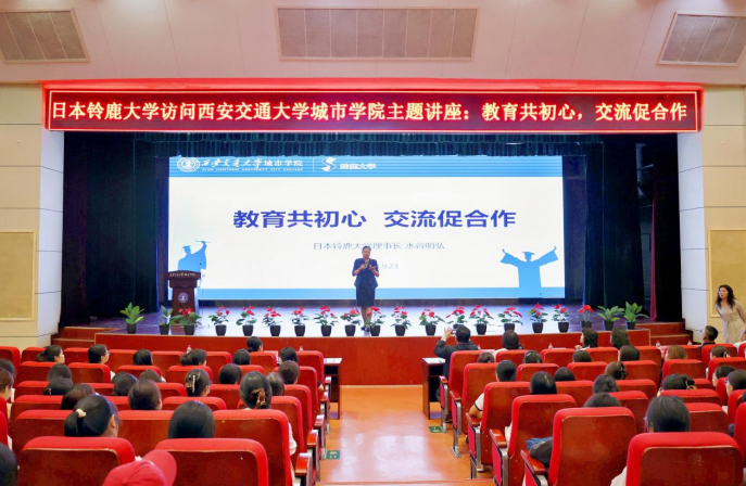 随后,水谷明弘理事长移步至教二报告厅,为护理与康复学院的学生们带来了主题为“教育共初心,交流促合作”的讲座。讲座中,水谷明弘理事长分享了日本教育的理念,向学生们讲解了铃鹿大学对中国留学生的政策,详细说明了专业情况和课程设置,鼓励学生们积极参与国际交流,拓宽视野,激发了学生们对留学的兴趣。日本铃鹿大学西安代表王晓韵介绍了铃鹿大学的短期交换留学项目以及2+2中日双本科国际课程联合培养项目的优势,吸引了学生们的关注与提问。