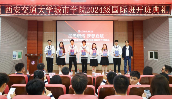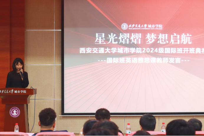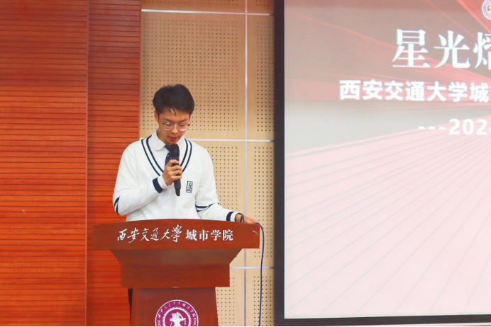2022级金融国际班吴彤作为老生代表用全英文发言,寄语学弟学妹做好时间的合理规划,培养自主学习能力,珍惜国际班这段旅程中的每一刻,勇敢地追求自己的梦想!2024级国际班高渔樵作为新生代表用全英文发言,他讲到,国际班为大家提供了一个独特的学习机会,在这里可以感受到东西方文化差异以及多元学科交融的全新学习体验,加入国际班标志着大家进入城院后一段非凡旅程的开始,每一位国际班学子都对未来充满了无限的期待!