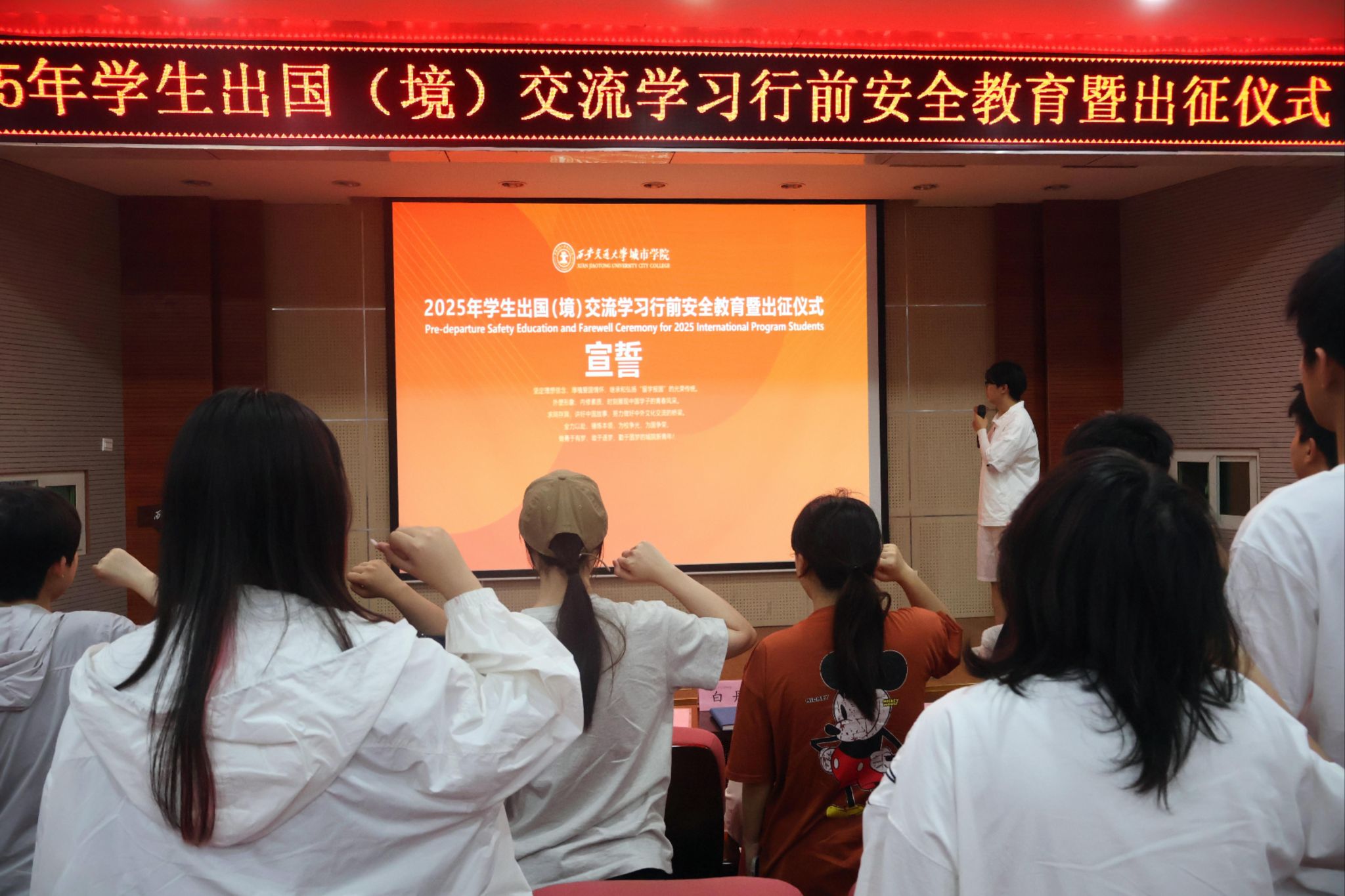 授旗仪式上,朱旭副校长(代理校长)将印有校徽的出征旗帜授予学生代表张嘉乐,这面旗帜象征母校的期许与托付。随后,传媒与外国语学院谭杰元同学带领全体出国学子庄严宣誓:“传承留学报国传统,锤炼本领为校争光,做敢于有梦、勤于圆梦的城院新青年!”铿锵誓言展现了学子们昂扬的精神风貌。