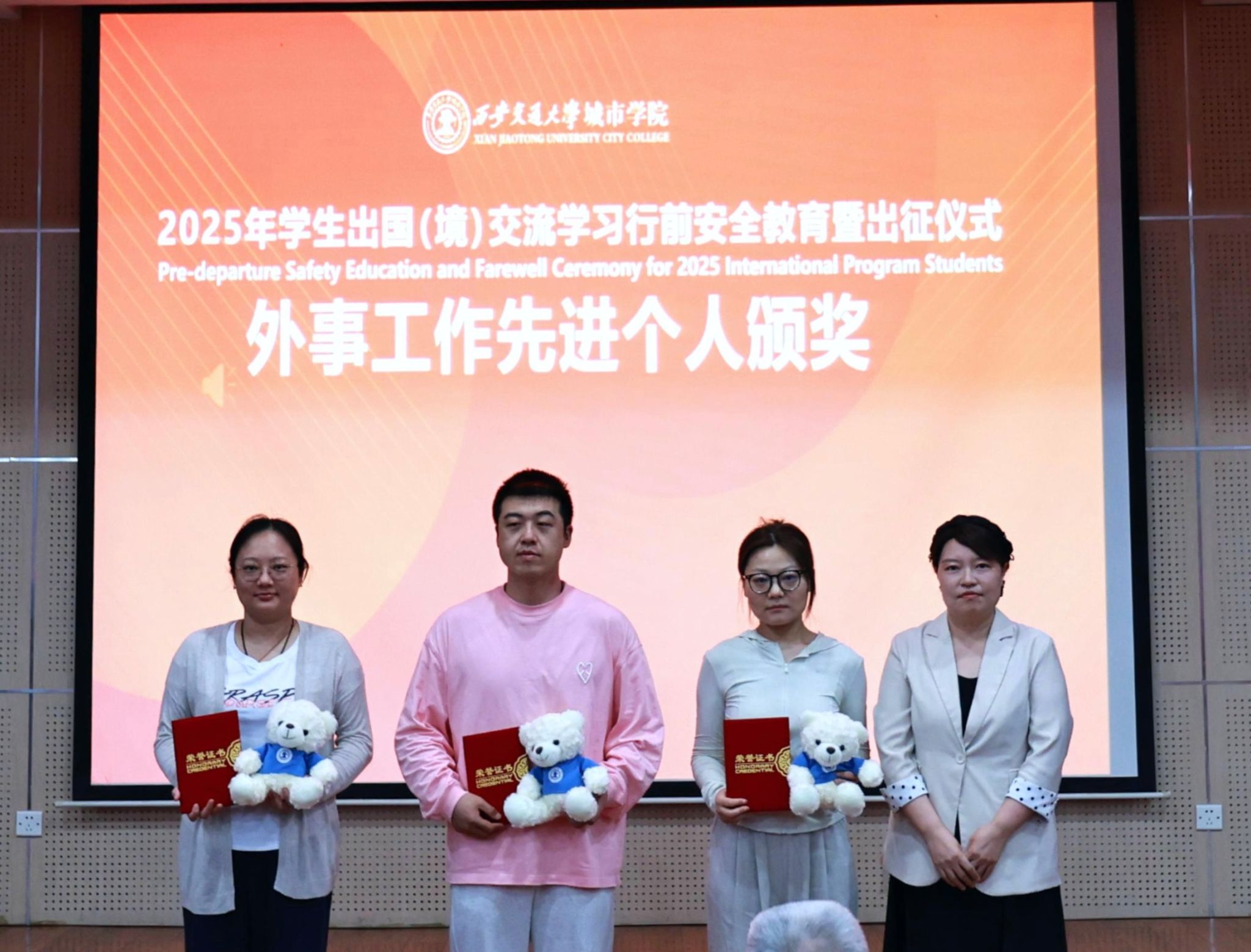 学校为学子们精心准备了具有特殊意义的定制小熊与录取通知书;图书馆特别为双学位项目学生颁发了“校友终身图书卡”。张勇馆长表示:“无论你们身在何处,母校的知识殿堂永远为你们敞开。”仪式上还对廉宇婷、王艺博、康轲岚三位在2024-2025学年外事工作中表现突出的辅导员老师进行了表彰。