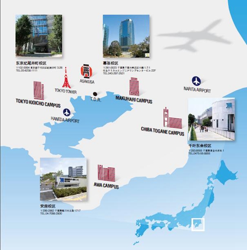 (三)城市简介: 城西国际大学的校舍和地理位于东京首都圈,拥有4个校区和多处教育设施。千叶东金校区是学生们生活的主校区,从东京,横滨,成田都有宇的校车往返。从千叶东金校区到东京市中心的东京车站只需65分钟,费用只是一般公共交通轻轨电车的一半,非常方便。另外观光学院的校区位于风景秀美的太平洋海岸的观光城市安房鸭川市,站在校园内,就能远眺一望无垠的太平洋。东京纪尾井町校区更是在东京市中心的日本政治中心永田町附近,邻近日本国会大厦,首相官邸和各中央行政机构,交通极为便利。