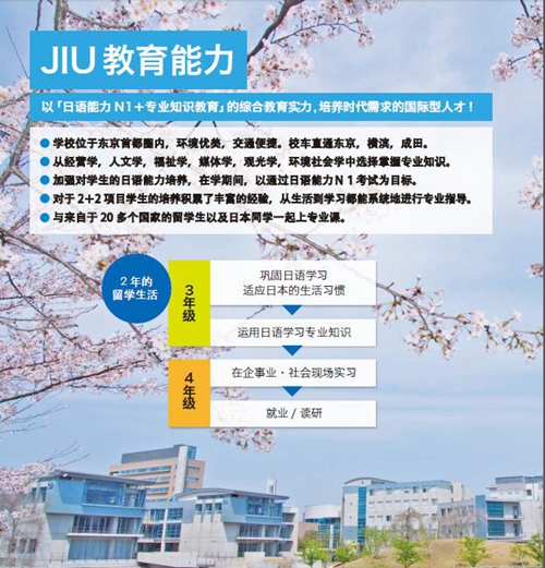 (四)、学校介绍: 城西国际大学(Josai International University,简称为JIU),是于1992年设立的日本私立大学。由学校法人城西大学运营,和城西大学是姊妹校。其教育理念是“学识塑造品格,完善自我以适应国际社会”,目前拥有千叶东金校区、东京纪尾井町校区、安房校区以及幕张校区四大校区。学校拥有六大学部,其中经营信息、传媒、国际人文、环境社会、观光和福祉学部招收来自各国的留学生。在校学生人数约为5069人。 城西国际大学和美国、加拿大、英国、澳大利亚、西班牙、挪威以及中国等著名大学建立良好合作关系,输送学生进行长短期交流。其中中国的首都师范大学、传媒大学、北京电影学院、北京外国语大学、大连理工大学、天津外国语大学、西安外国语大学等都是合作大学。 城西国际大学主页:www.jiu.ac.jp