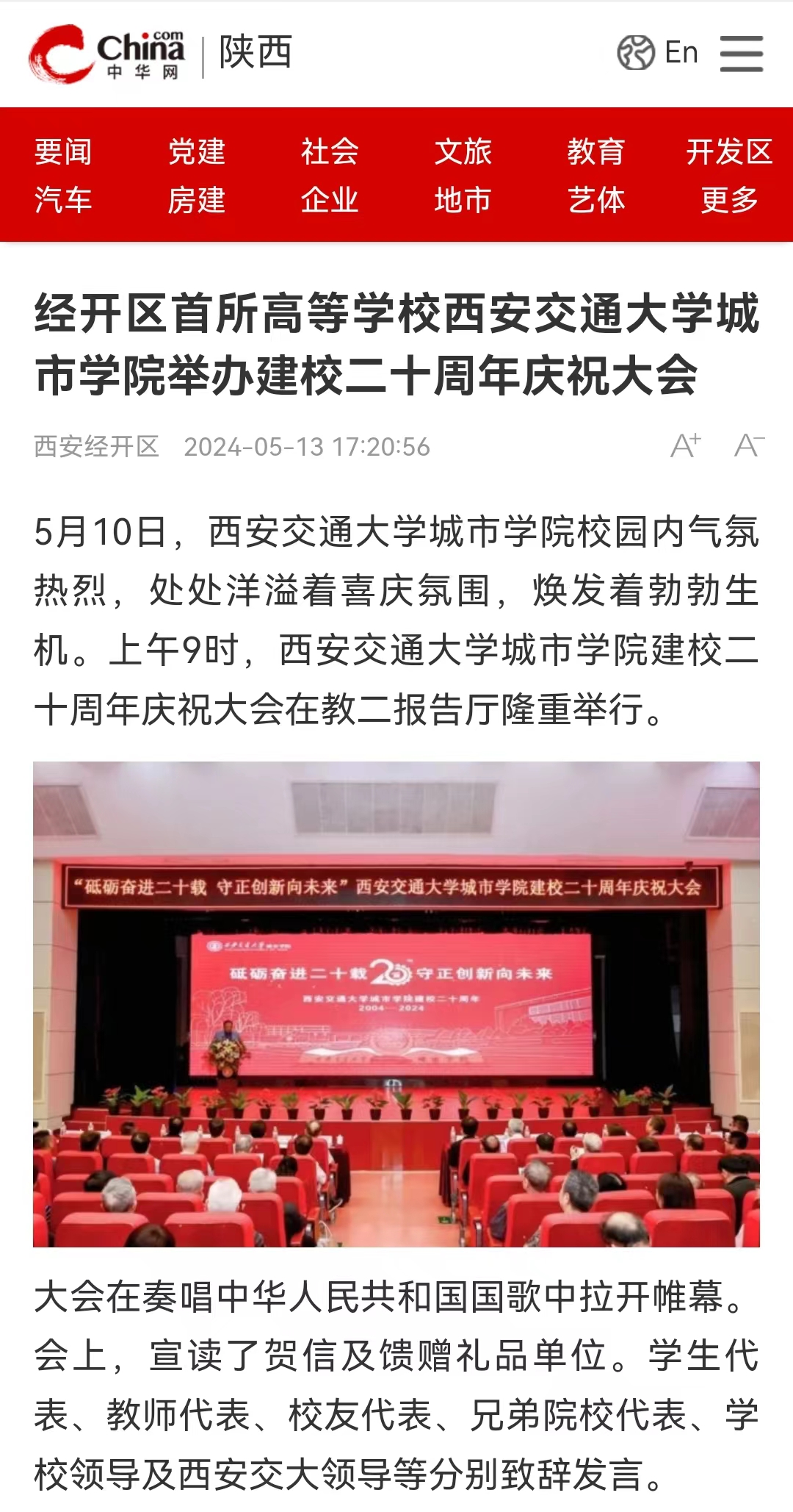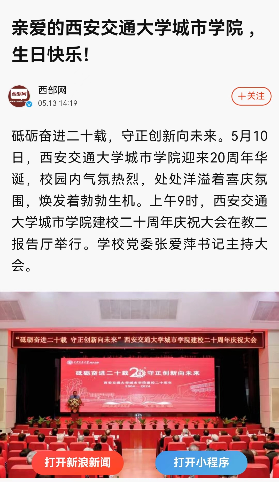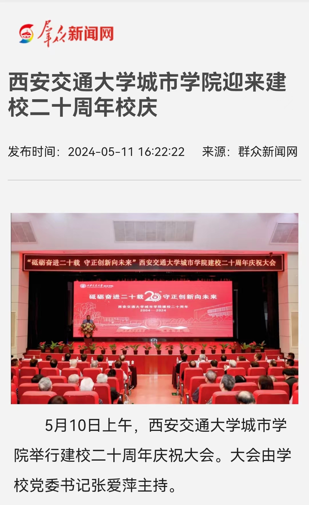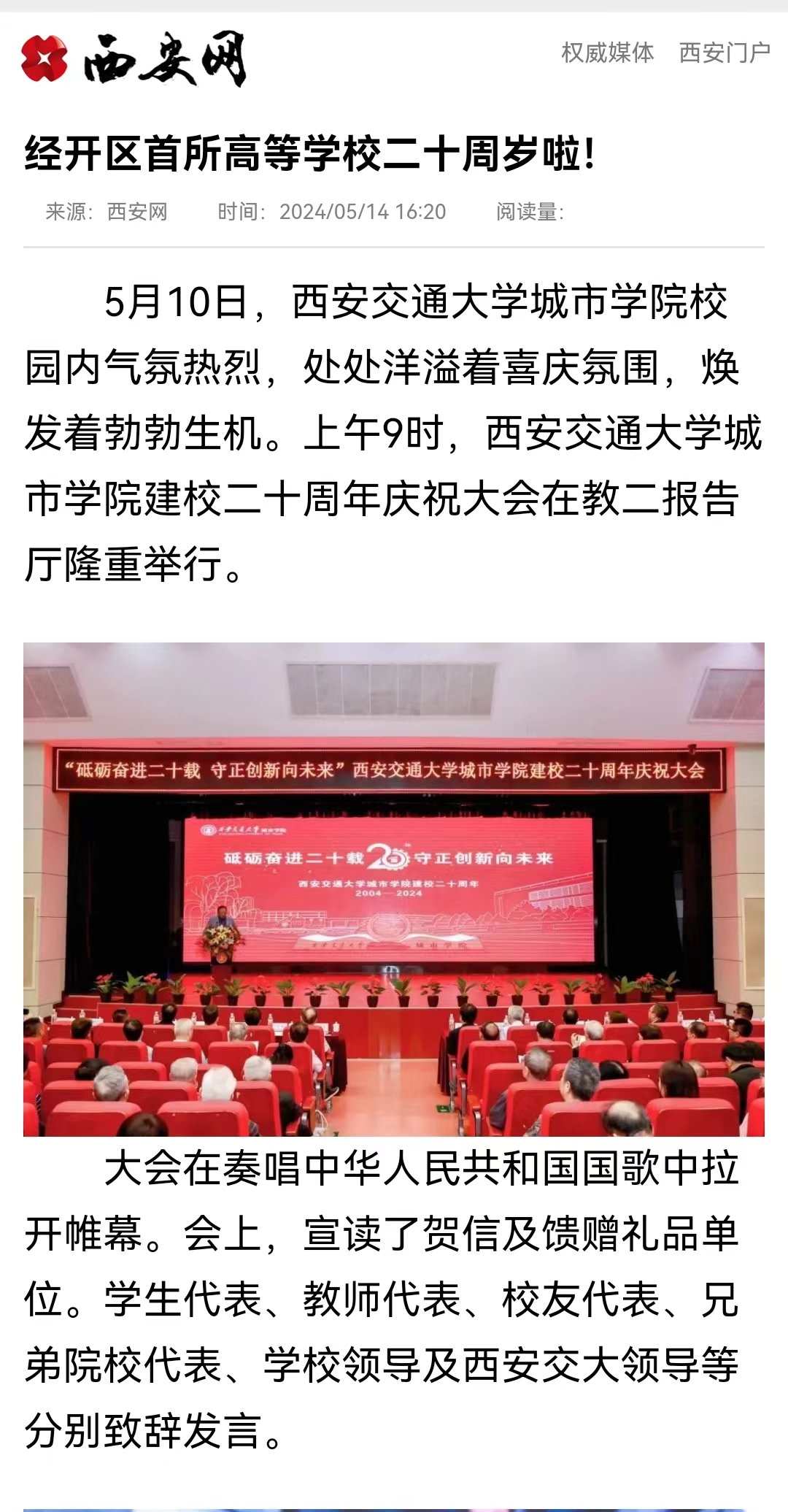 5月10日,威尼斯7798cc建校二十周年庆祝大会在教二报告厅隆重举行。大会在奏唱中华人民共和国国歌中拉开帷幕。会上,宣读了贺信及馈赠礼品单位。学生代表、教师代表、校友代表、兄弟院校代表、学校领导及西安交大领导等分别致辞发言。多家媒体、单位关注和报道。