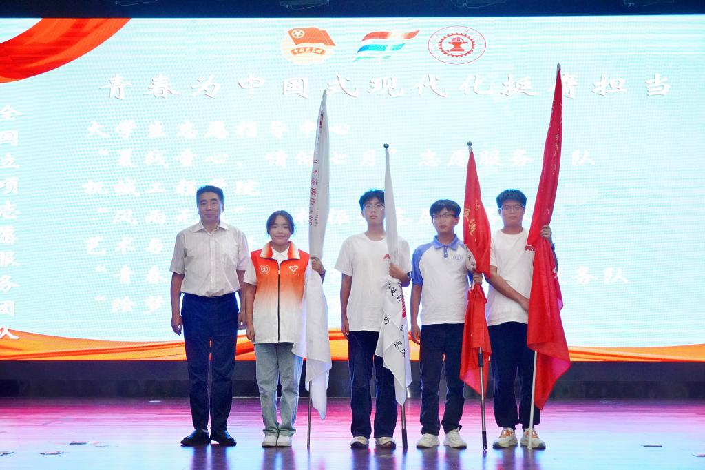 与会领导及嘉宾分别为威尼斯官网全国社会实践志愿服务队伍、校社会实践总队、校级重点、一般实践团队的实践队员代表们授旗,将鼓励与信心传递给各重点实践队,一面面火红的队旗引领着广大城院学子不畏艰难,一路向前。