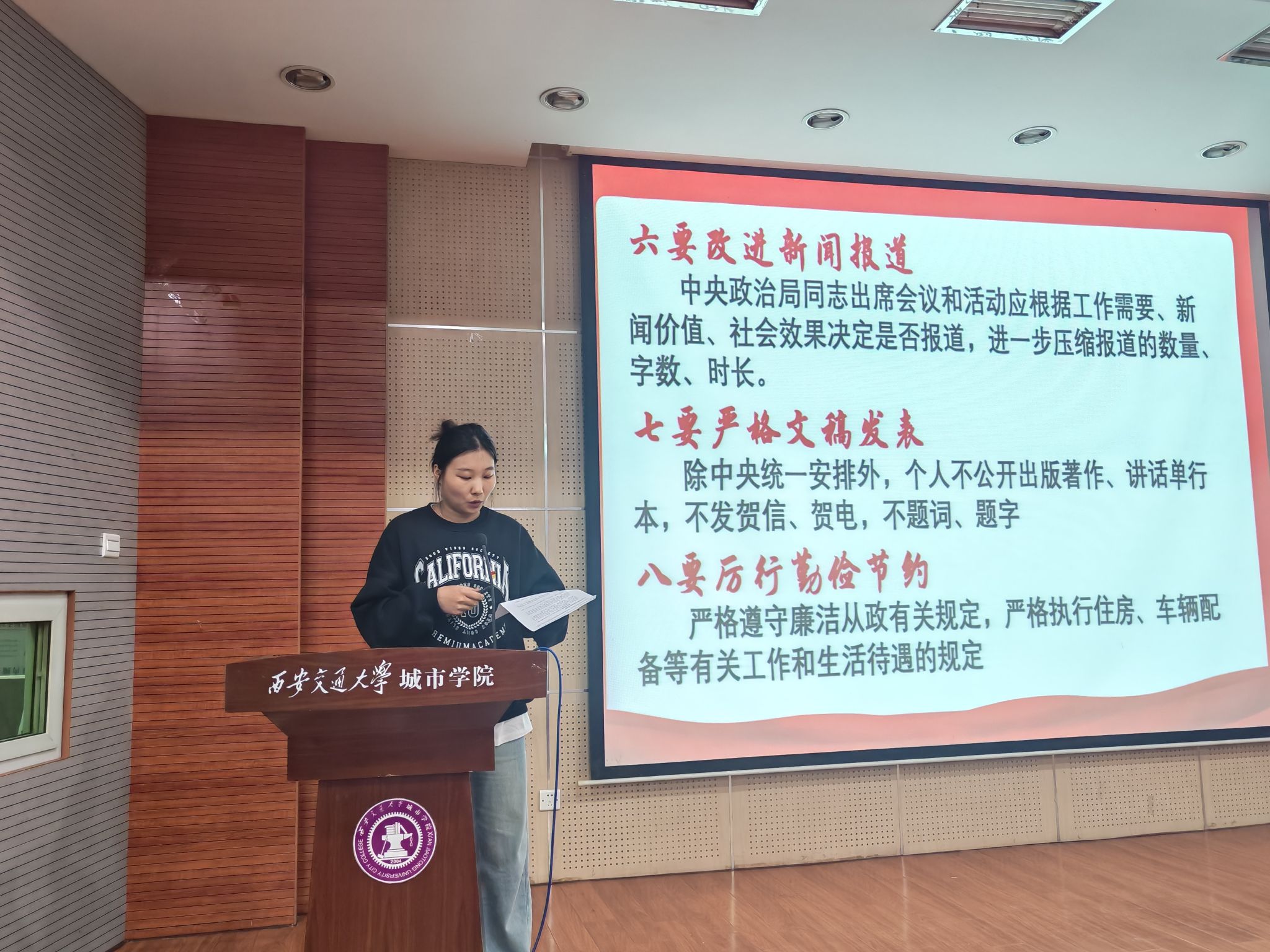 李璐带领全体党员逐字学习了中央八项规定的具体内容,并结合学生党员在日常学习和生活中的实际情况,分享了如何在点滴中落实规定要求。